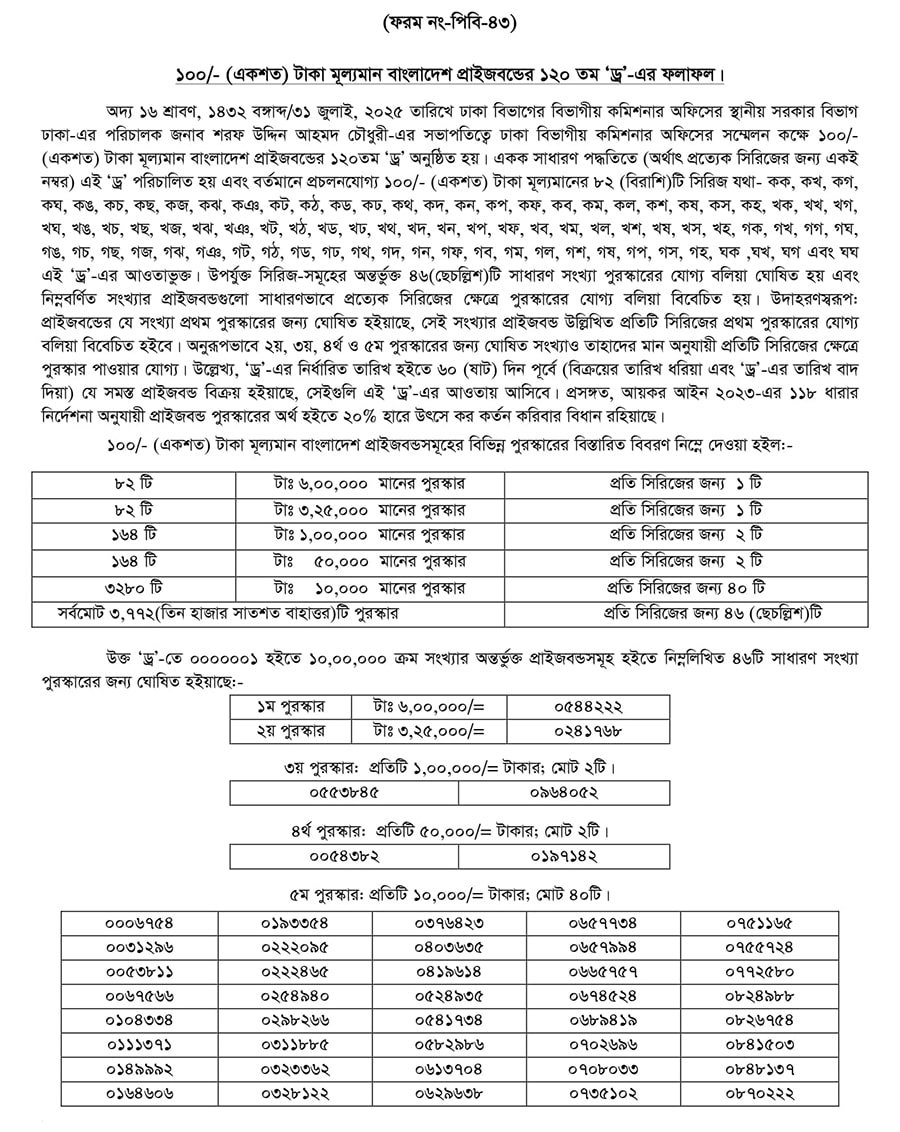 Presently, the Govt. of Bangladesh, in order to encourage savings, is offering prize bonds with face value of Tk.100 each. Any Bangladeshi including children can buy any amount of bonds. Only that Prize bond whose date of issuance is at least 60 days prior to the draw date is eligible for draw. You can purchase and sell prize bonds at any branch of any Bank and Post Offices. besides If you have any question about Bangladesh Bank 121th Prize Bond Draw Result 2025 then comment below or message us through facebook.