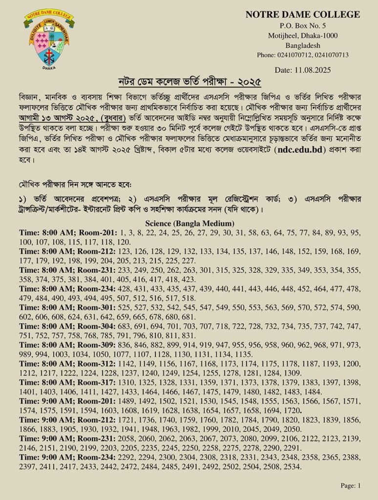 Notre Dame Admission Result 2025 will be published on 11 August 2025.